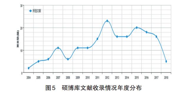 博学位论文只有 5 篇。2019 年数据尚未收录。大致趋势与全库文献收录情况相似。在一些重要指